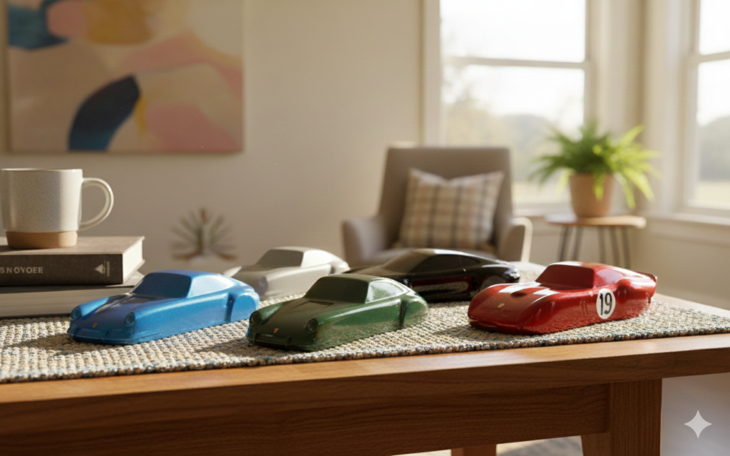 Chaque pièce est façonnée à la main pour capturer les lignes et l’âme des voitures emblématiques.